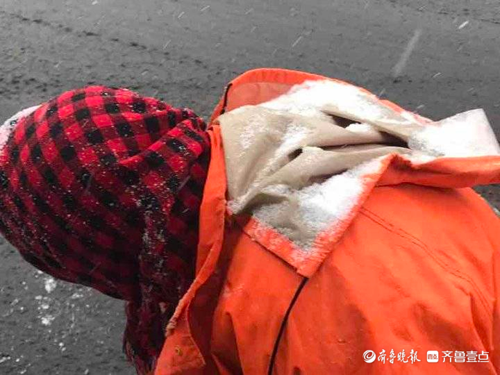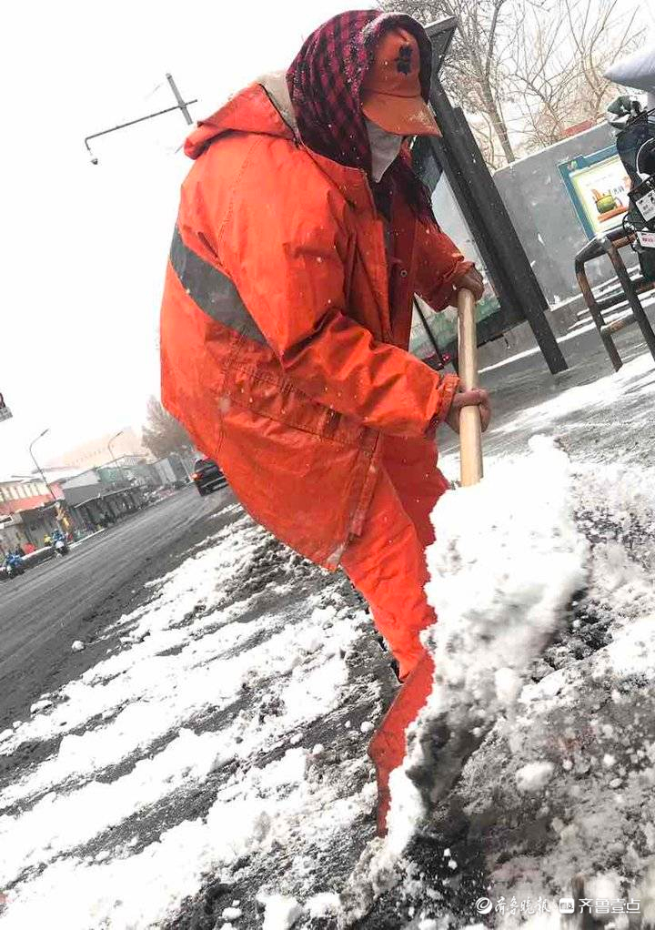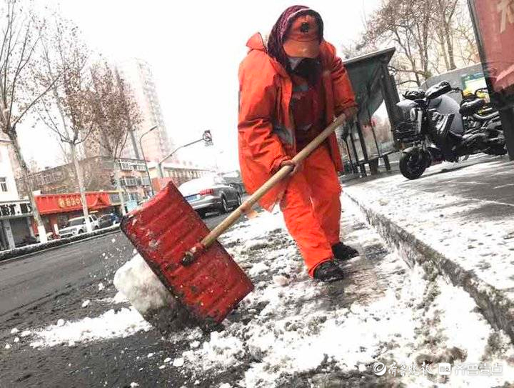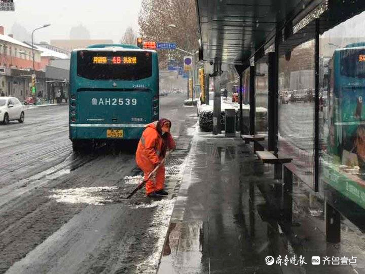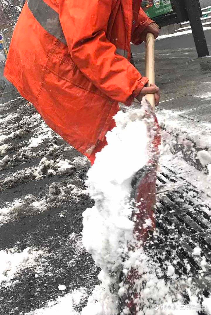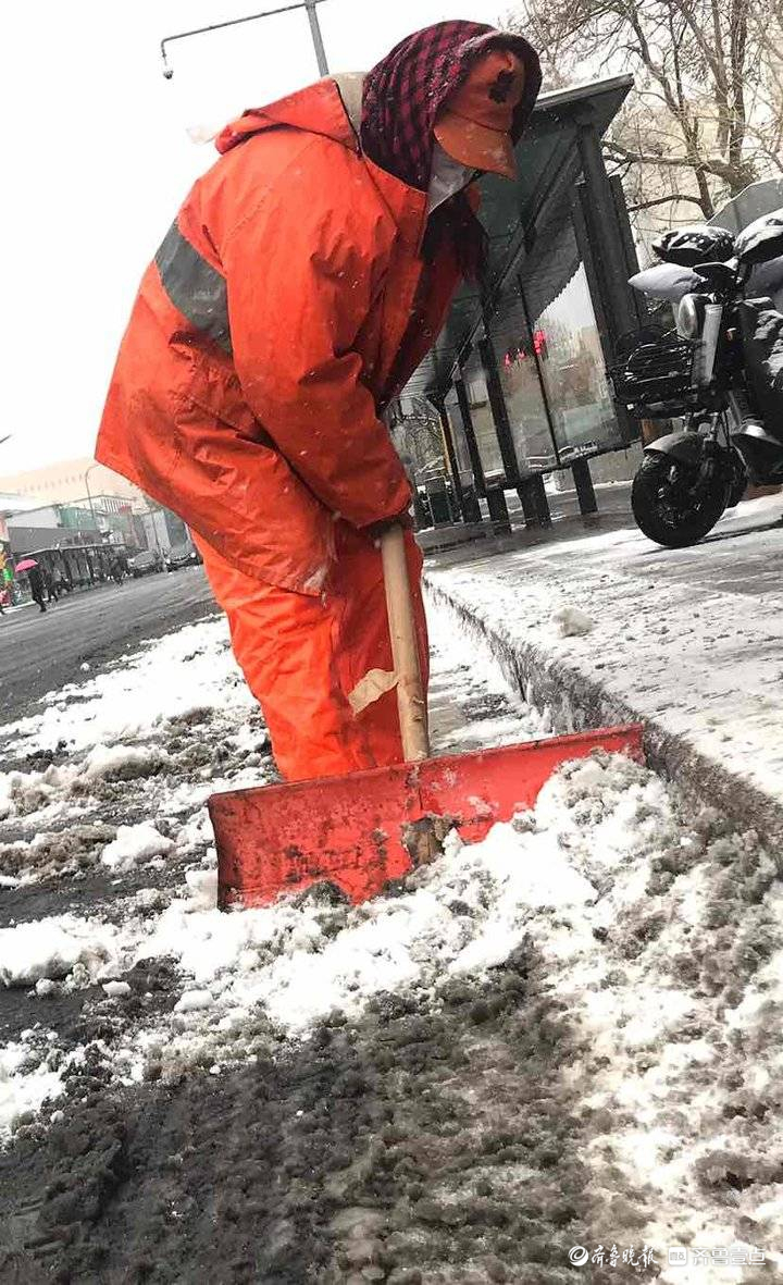14日,一场风雪随寒潮降临济南,文化东路山师公交车站,一名张姓女保洁员正在冒雪清除路基边上厚厚的积雪,以方便乘客上下车。雪越下越大,这名保洁员的鞋子已经被雪水浸透。