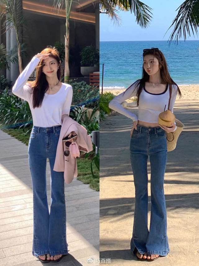 第三类与之搭配的单品是纯棉上衣,可以是长袖也可以是T恤,慵懒上衣与紧身喇叭裤搭配最带感,像博主一样出现在海边,舒服惬意。