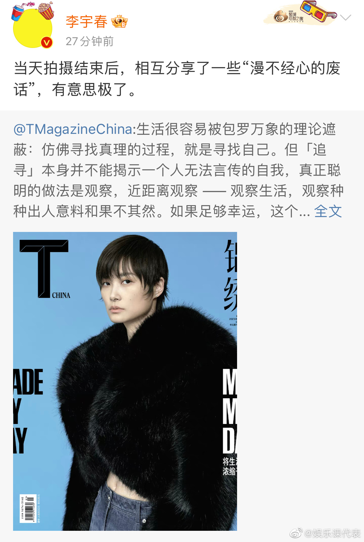 #李宇春狼尾发型大片# 李宇春最新五月刊封面大片来啦,黑色大衣搭配黄色花花鞋子,表现出别样的风格,让人眼前一亮,时髦又个性,每个造型都能完美hold住~