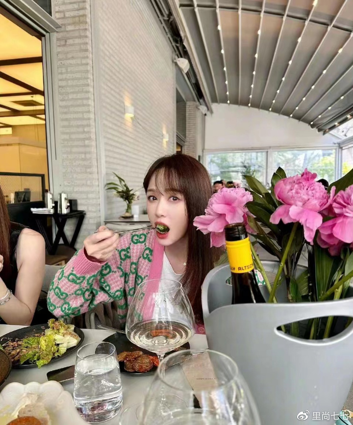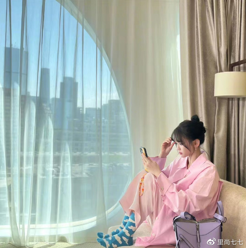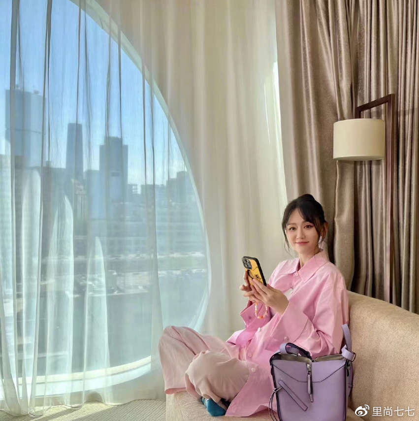 陈乔恩一身粉色穿搭,色彩的饱和度很高,衬衫和裤子的粉色色调不同,但搭配的恰到好处,颜色的层次感突出。宽松的衬衫呈现oversize风,宽松的衣服穿在身上很有范儿,且能有效遮挡身材的劣势。