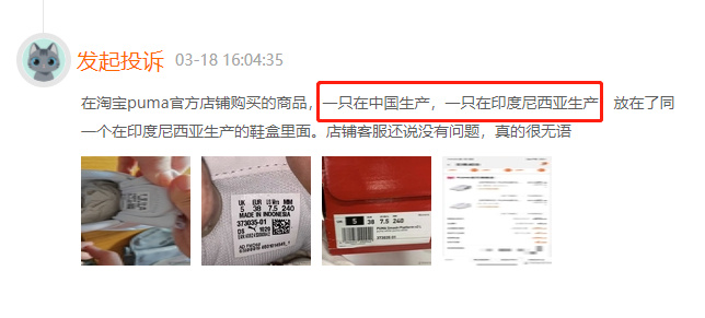 近期,有用户在黑猫投诉【投诉入口】平台反馈,在PUMA购买的一双鞋,一只显示中国生产,一只为印尼生产,都放在了同一个在印度尼西亚生产的鞋盒里面。店铺客服表示没有问题。你有关注过运动鞋的制造商吗?