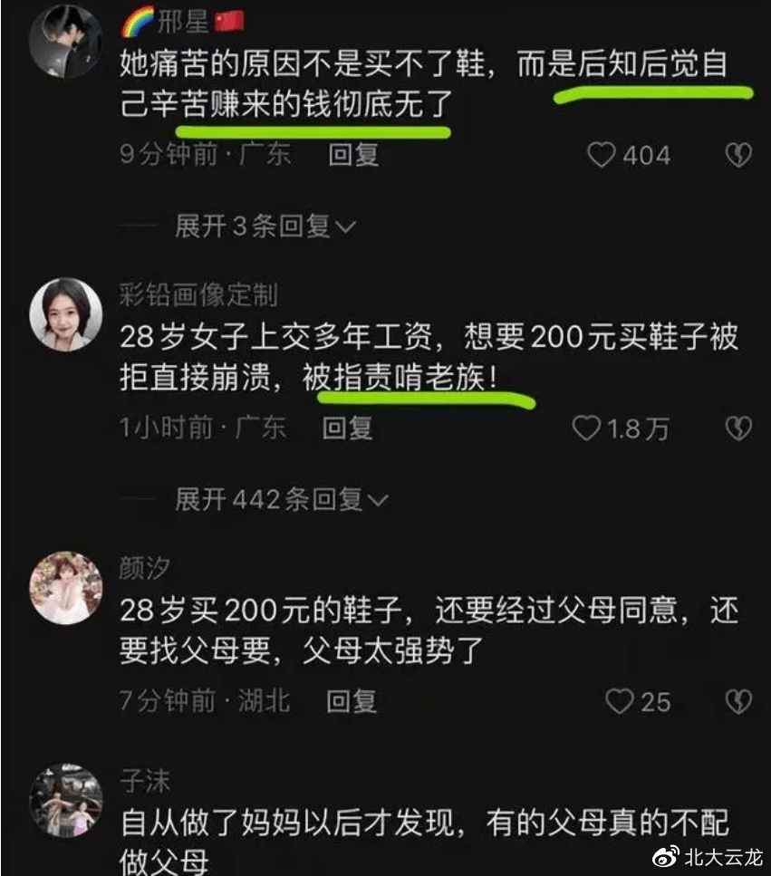 对于一般收入的家庭来讲,还是能够承受起的,而女生也有自己的经济来源,但却没有经济自由的权利,一双200元的鞋子直接遭到了家长的拒绝。