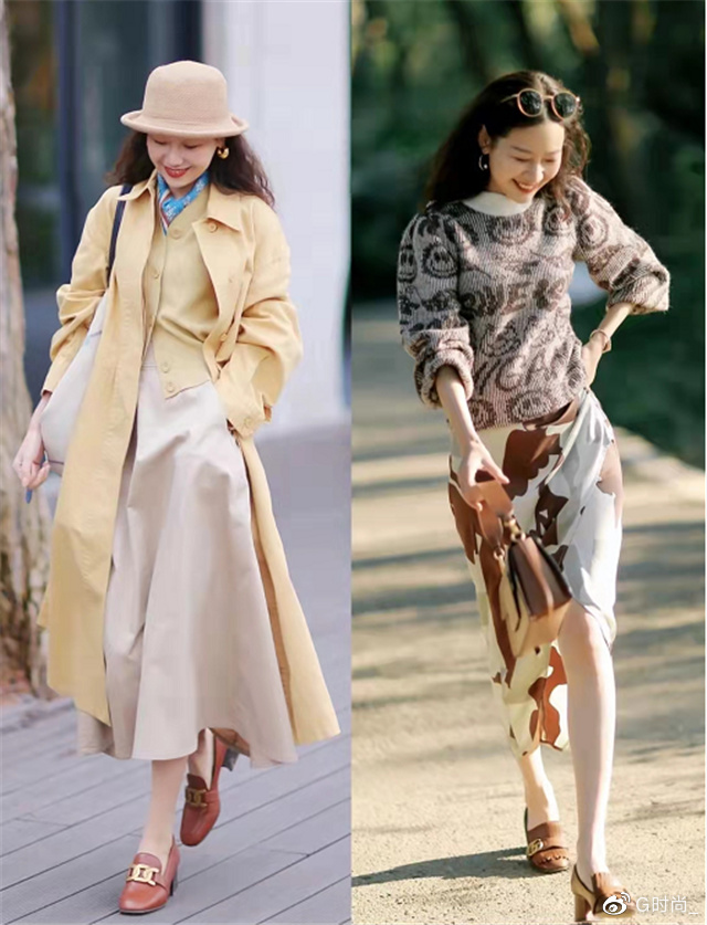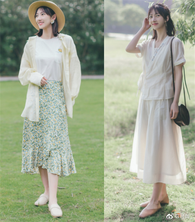 各种浅色的裙装搭配上浅色的平底鞋,舒适又耐穿,看上去很柔和。