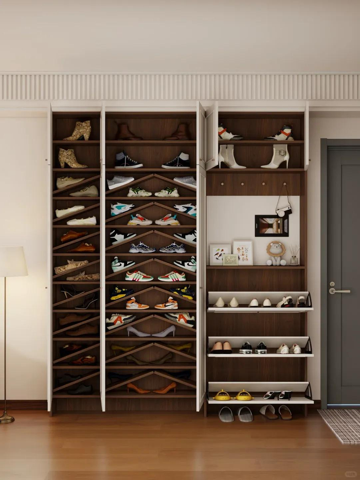 2. 隐形翻板鞋柜:如果墙面空间窄,就用 20-30 厘米的浅空间装悬空层板或倾斜搁板,鞋底刚好卡住,视觉上轻盈不笨重,打扫时也不用弯腰搬柜子,还能避免鞋子受潮发霉。