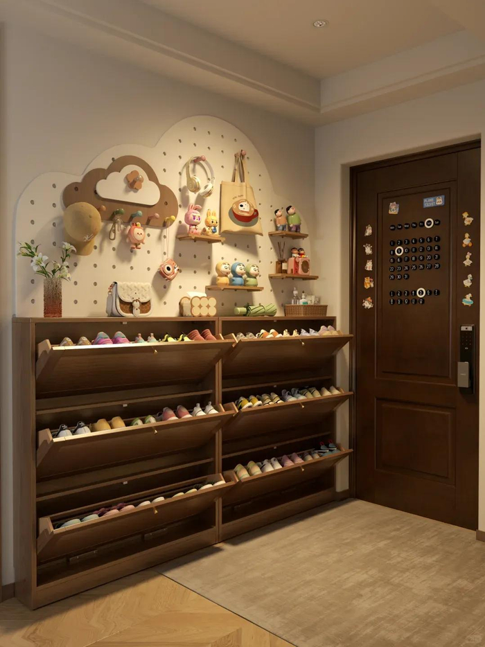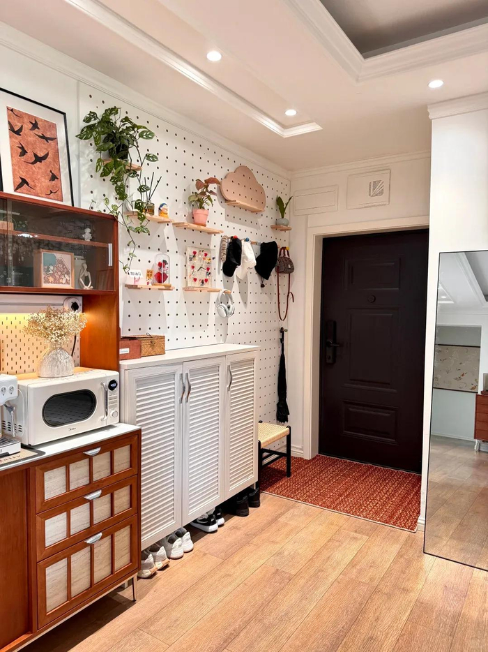 3. 窄玄关洞洞板 + 餐边柜组合:若玄关宽度只有 1.5 米左右,传统鞋柜放不下,就装顶天立地的洞洞板,既能挂钥匙、小物件,还能挂轻便鞋架;旁边放个多功能餐边柜,既能当水吧台,又能收纳杂物,让窄玄关实现 “收纳最大化”。