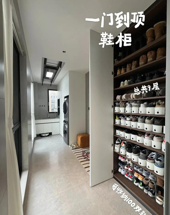 4. 阳台 “鞋子集中营”:把次阳台的一角改造成鞋收纳区,定制多层鞋柜,再配个烘鞋器,梅雨季也不用担心鞋子受潮有异味。这样既不占用公共区域,又能集中收纳全家人的鞋子。