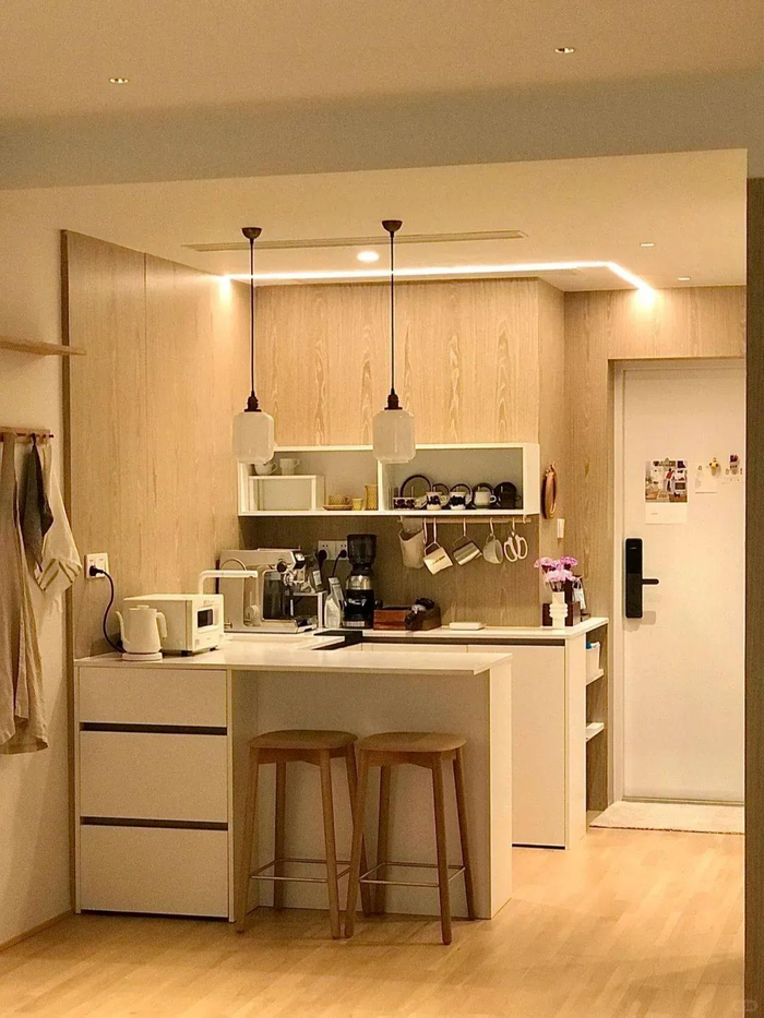 打破玄关的单一功能,把它打造成放松小天地。摆一张小巧的吧台桌,配两把高脚椅,早上冲杯咖啡唤醒活力,晚上小酌一杯舒缓疲惫,生活仪式感直接拉满。