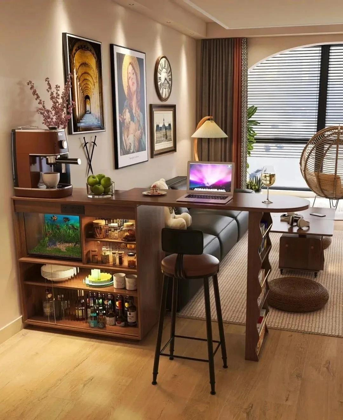 吧台下方可以设计抽屉和开放式格子,收纳酒杯、茶具、零食,墙上安装壁挂酒架,展示喜欢的酒水或装饰品,再加装一个小型水槽,洗杯子、切水果都方便。角落放一台迷你冰箱,饮料、水果随时可取,让玄关成为家里最惬意的 “小角落”。