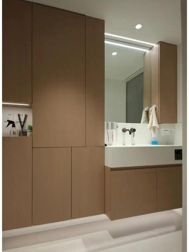 洗手台下方做封闭收纳柜,洗手液、擦手巾、清洁用品都能藏起来,保持台面整洁。再搭配一面穿衣镜,既能整理仪容,还能让空间视觉上更开阔。家里有小朋友的话,加装一个可调节脚踏,方便孩子自己洗手,培养卫生习惯。